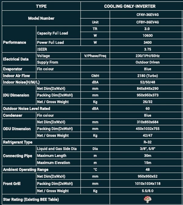CFAY-36EV4G Inverter Cassette Air Conditioner 3 Ton 4 Star