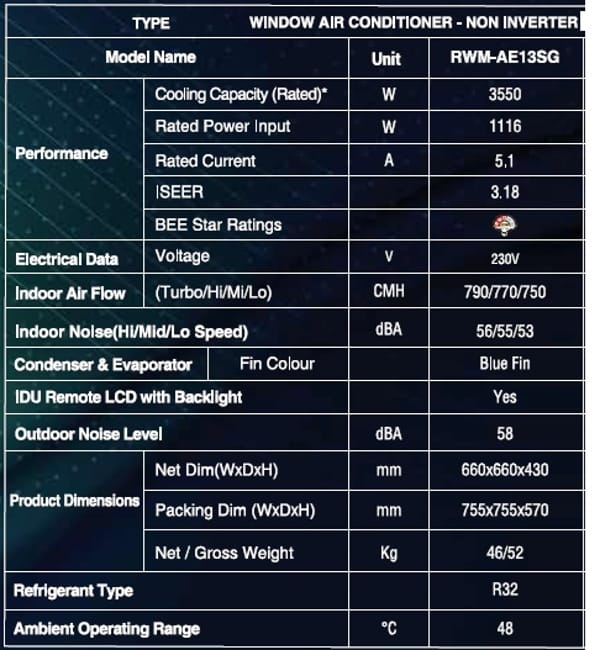 " RWM-AE13SG" Window Air Conditioner 1 Ton 3 Star Ac India